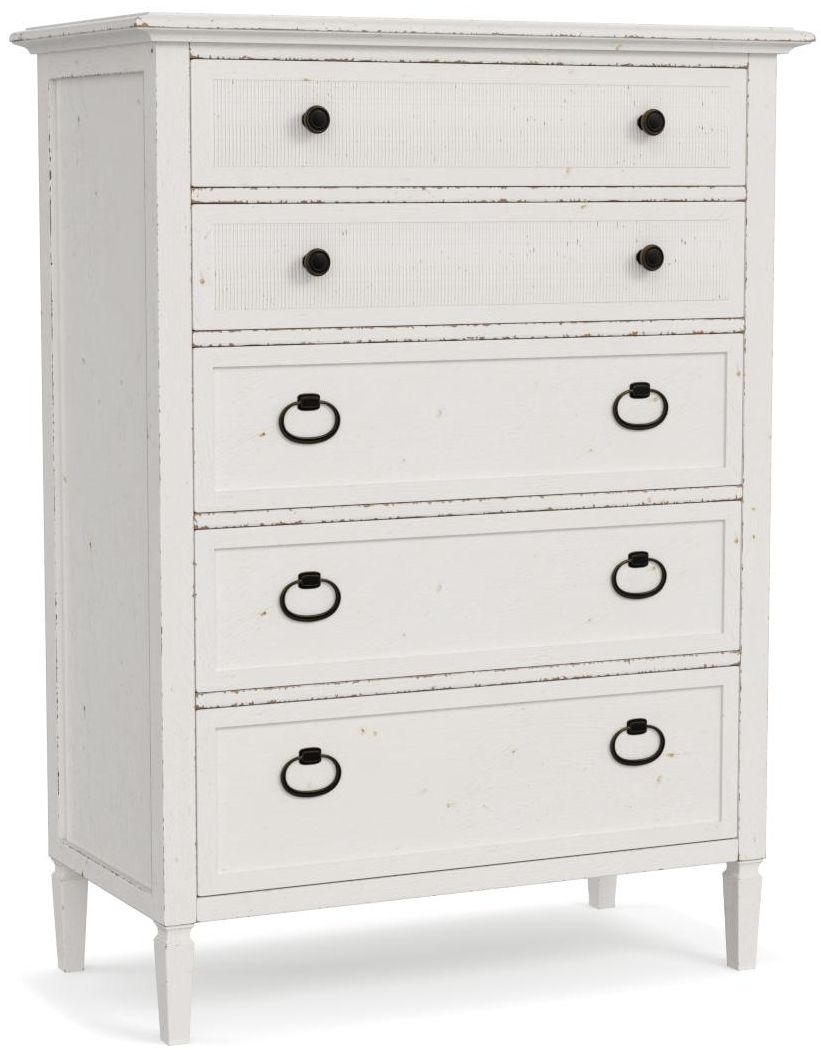 The Shoreline collection has characteristics of the relaxed coastal style with hints of transitional elements. This bedroom offers a Sea Salt finish, making it easily adaptable to many spaces. Ribbed top drawers on case pieces bring an element of texture to the collection. Drawer fronts are adorned with custom oval ring pulls in an oil rubbed bronze finish. A simple, straightforward bed complements the cases, and completes the bedroom. Shoreline is a bedroom which will feel at home whether you live at the shore, or simply cherish the relaxed simplicity that a coastal life can bring. Case pieces and storage beds also feature soft self-closing drawer guides.Read More