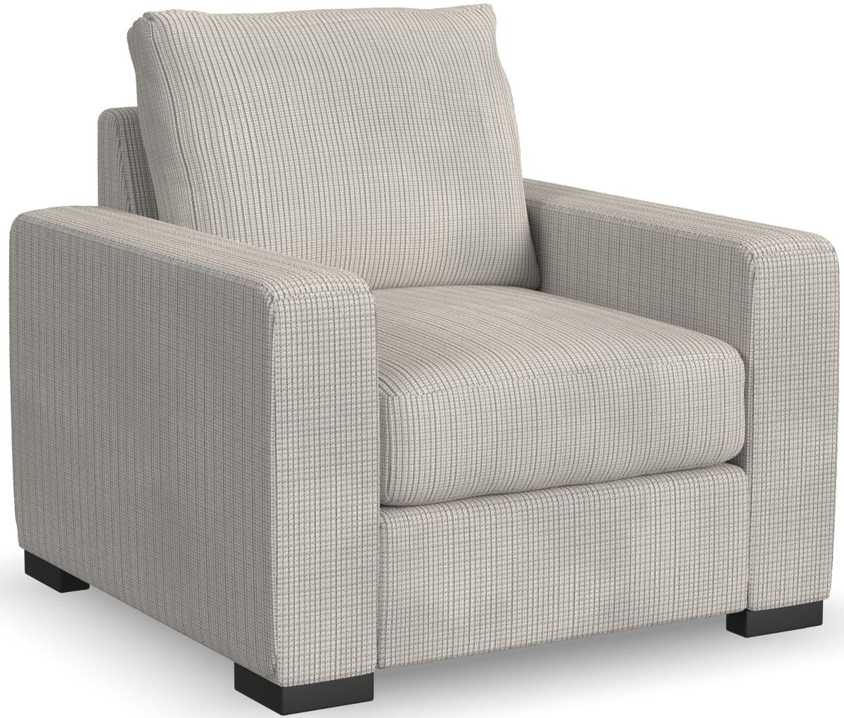 A square, loose back cushion sits atop a plush, square seat cushion that will retain its shape over time and can be flipped and rotated. Black recessed block legs put this piece low to the ground for casual comfort. Choose from two carefully selected fabrics to suit your home's style.