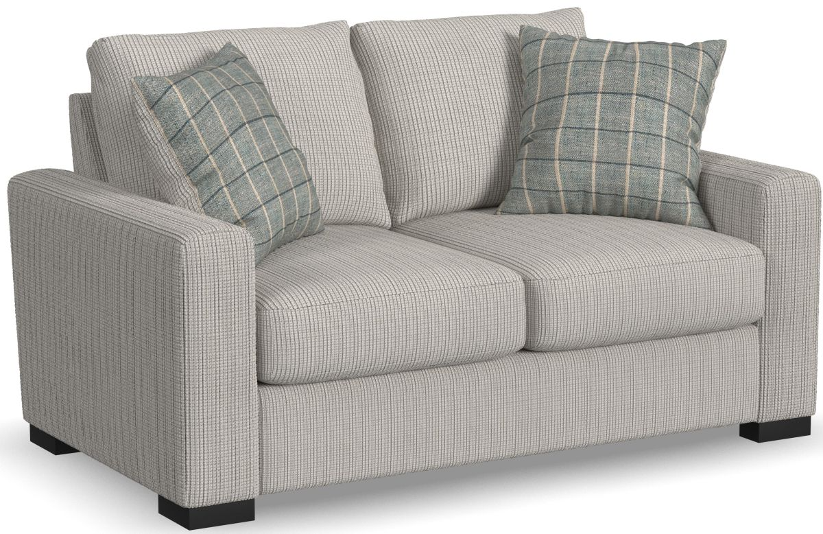 Two square, loose back cushions sit atop two plush, square seat cushions that will retain their shape over time and can be flipped and rotated. Black recessed block legs put this piece low to the ground for casual comfort. Choose from two carefully selected fabric combinations, and style it based on your mood with two-sided accent pillows.