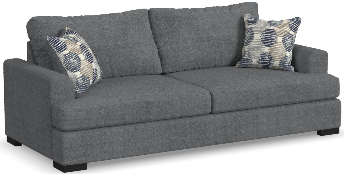 Two wide, loose back cushions provide a more contemporary aesthetic and invite you to kick back and sink into two wide, deep and durable seat cushions for the ultimate casual comfort. Black recessed block legs put this piece low to the ground. Finally, choose from two carefully selected fabric combinations, and style it based on your mood with two-sided accent pillows.