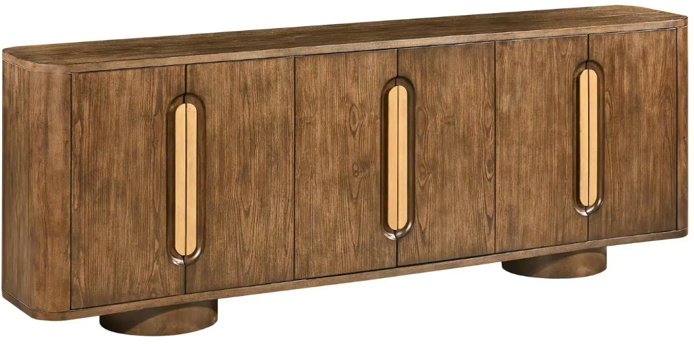 Bring sculptural elegance to any space with this six-door credenza. Crafted from wood with a rich brown stained finish, its rounded edges and circular pedestal feet soften the linear silhouette. Elongated oval handles in a two-tone gold and bronze metal add a luxe accent. Inside, three fixed shelves provide ample hidden storage.Read More