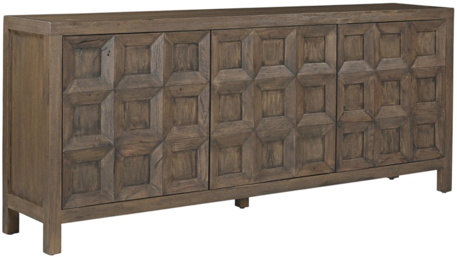 Crafted from mango wood with a rich brown finish, this three-door sideboard blends organic character with architectural style. Faceted paneling creates a sculptural cube-like effect across the doors, enriched by visible knots and natural grain variation. Inside, three fixed shelves offer hidden storage.Read More