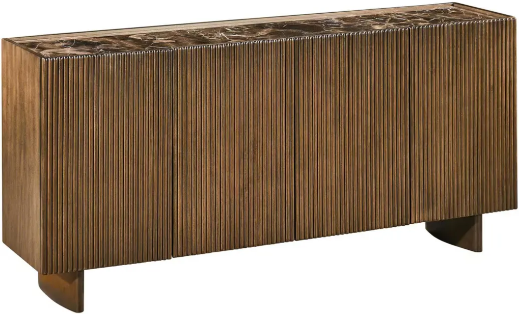 A bold blend of texture and elegance, this four-door sideboard features fluted wood doors, a rich brown stained finish, and a sculptural curved base. Topped with a tray-style marble surface, its organic veining adds natural beauty. Inside, two fixed shelves and European hinges combine form with function.Read More