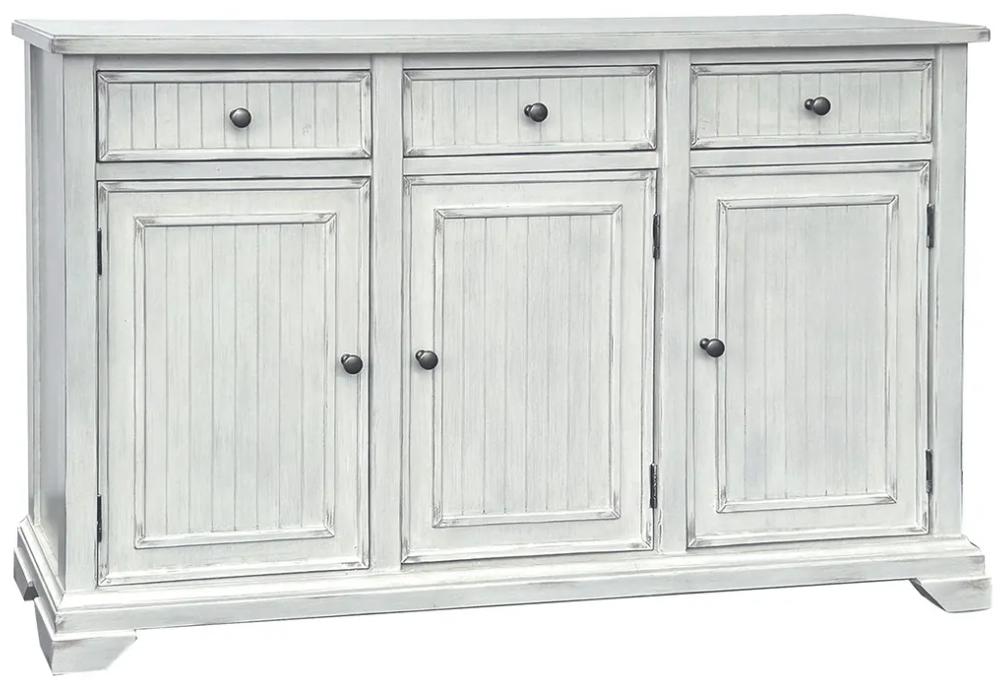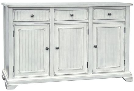 Welcome coastal charm into any room with this cottage-inspired sideboard. A hand-rubbed white finish highlights classic beadboard doors, turned feet and antique-pewter knobs, while three drawers and three cabinet compartments keep linens, dinnerware or entryway essentials perfectly organized.Read More
