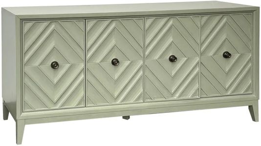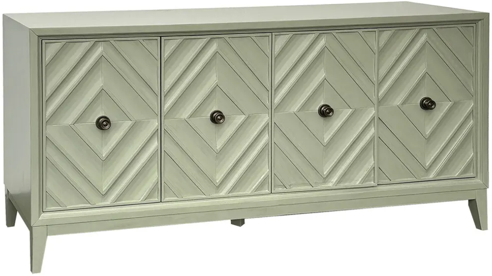 Refresh any room with this chic credenza, bathed in a tranquil sage finish and detailed with hand‑carved chevron doors. Behind the four push‑to‑open fronts you’ll find adjustable shelving ready to corral dining essentials, media components, or office supplies. A slim plinth base and gently splayed legs lighten the silhouette while rear cable ports keep wires tidy.Read More
