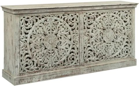 A celebration of craftsmanship and detail, this four-door media credenza is made from solid wood and finished in a distressed natural and taupe stain that highlights its timeworn character. Intricately carved floral medallions on the door fronts add depth and decorative interest.Read More