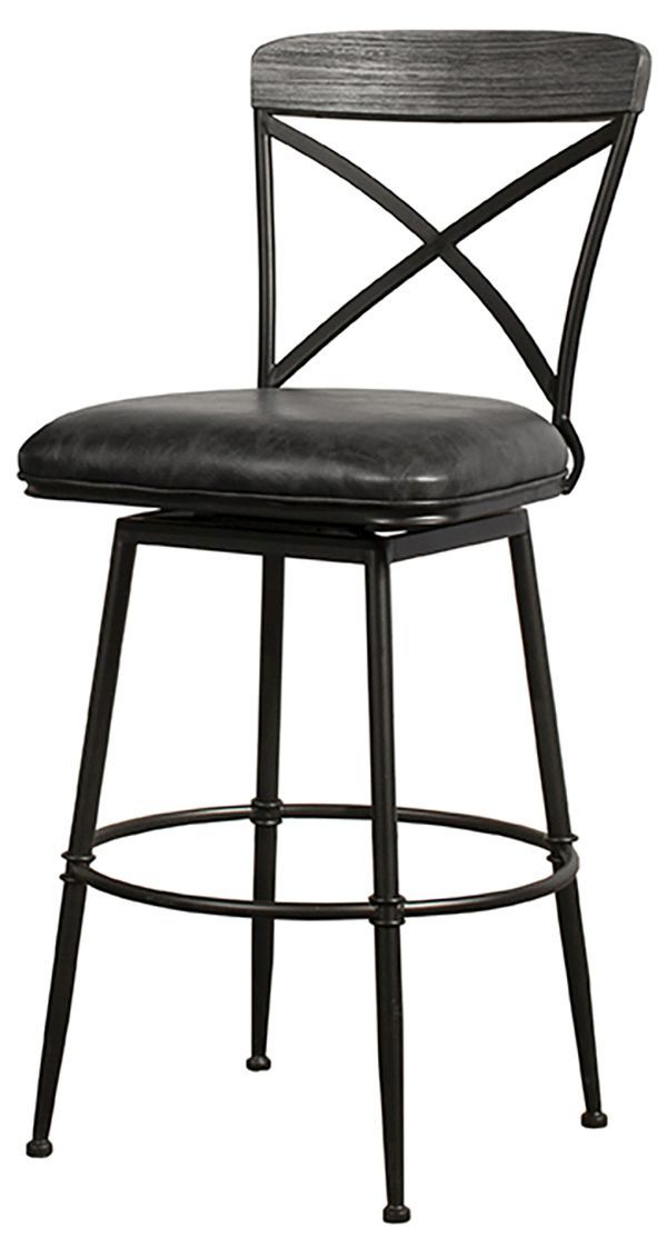 Decker Commercial Grade Stool in Gray Metal with Weathered Gray Wood and Charcoal Faux Leather From Modern Farmhouse to Industrial settings, the Hillsdale Furniture Decker Stool blends right in. Its versatile, mixed media design features heavy gauge tubular steel with a dark Gray finish, a Weathered Gray wood top rail, and amply padded seat with Charcoal faux leather upholstery. A perfectly placed footrest and 360° swivel functionality offer exceptional comfort. -Supports up to 500 lbs.