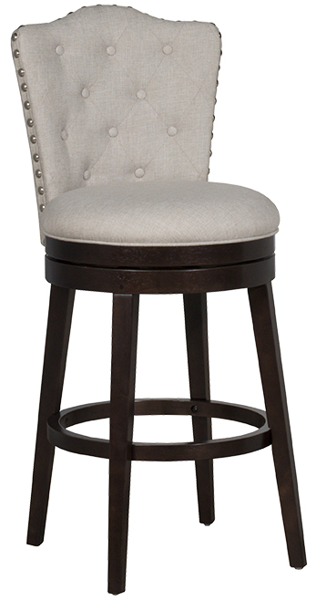 Classy and cushy. The Hillsdale Furniture Edenwood Swivel Counter Height Stool is reminiscent of English pubs -- with all the comforts of modern engineering. Cream upholstery with button tufting and nail head trim is timeless; while the compound arch and welt piping around the seat elevates the style and shows attention to detail. The Smoke Chocolate finished wood base features a convenient built-in footrest and 360° swivel functionality for unparalleled comfort. Showcase your sophisticated tastes at your counter height dining table or kitchen island with the Edenwood Counter Height Stool. Some assembly required.