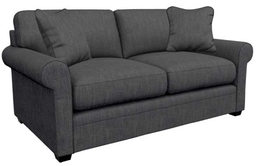 Rolled arms, decorative wood legs and welt trim lend laid-back refined style