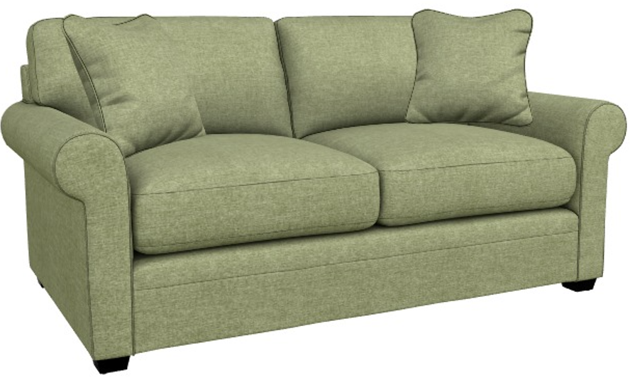 Rolled arms, decorative wood legs and welt trim lend laid-back refined style
