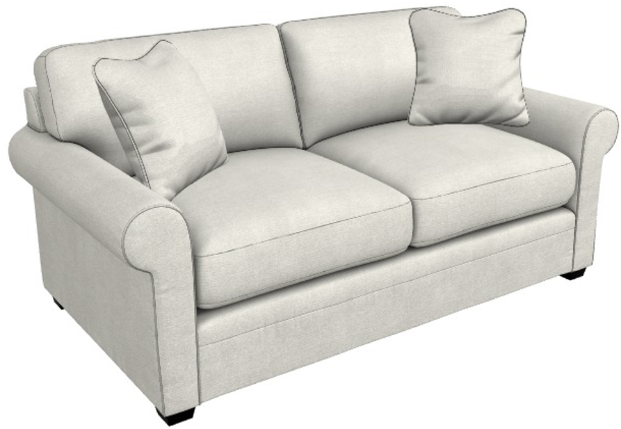 Rolled arms, decorative wood legs and welt trim lend laid-back refined style