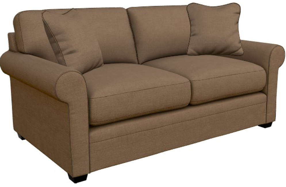 Rolled arms, decorative wood legs and welt trim lend laid-back refined style