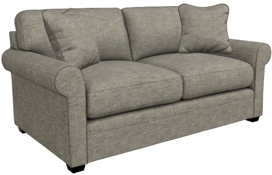 Rolled arms, decorative wood legs and welt trim lend laid-back refined style
