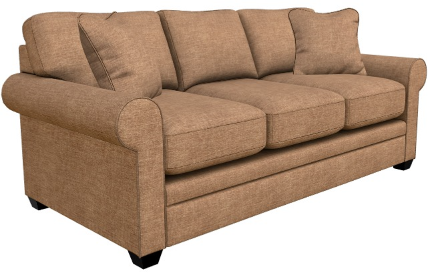 Rolled arms, decorative wood legs and welt trim lend laid-back sophisticated style