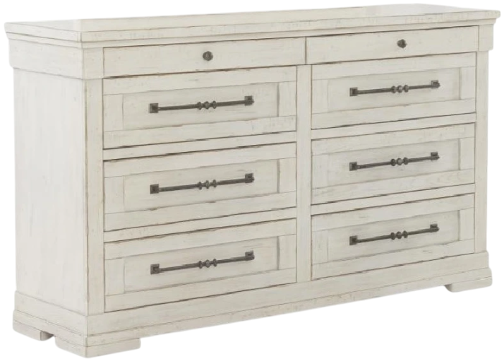 The Legacy Classic Coming Home dresser embodies timeless farmhouse beauty with its soft chalk finish and gracefully crafted details. Designed for both style and function, it offers generous storage through spacious drawers adorned with elegant hardware, perfect for organizing clothing and everyday essentials.Read More