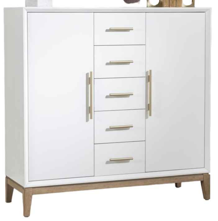 Crafted of select hardwood solids and white oak veneers and painted MDF, finished in cloud white and desert oak