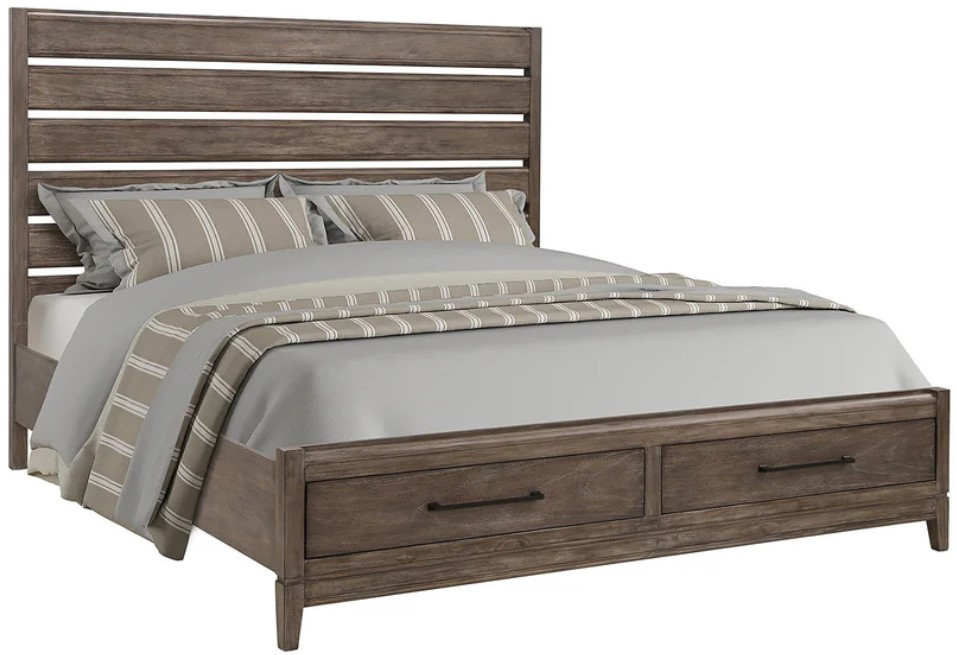 The Montrose Bed beautifully blends rustic charm with retro flair, showcasing a slatted headboard equipped with convenient USB ports. This bed also features two spacious storage drawers integrated into the footboard. Its sleek lines and subtle curves are highlighted by an elegant Greige finish, making it a stunning addition to any bedroom.Read More