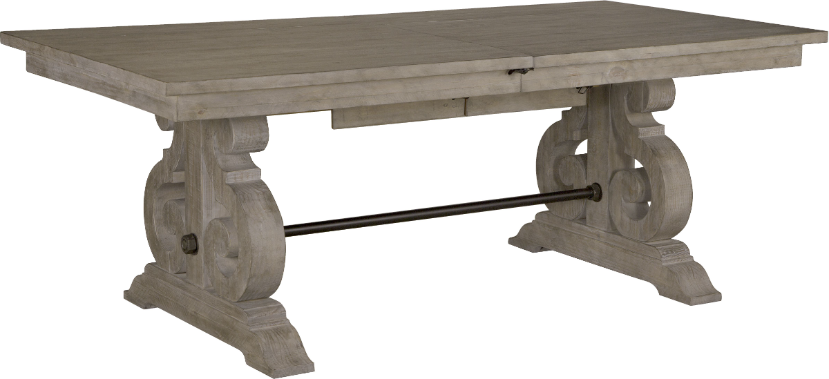 Set the perfect place setting at one of two round dining table sizes that features weathered pine solid tops resting atop open scroll work bases or select the larger rectangular double pedestal carved scroll base table with two butterfly leaves and a handsome weathered bronze metal stretcher.Read More