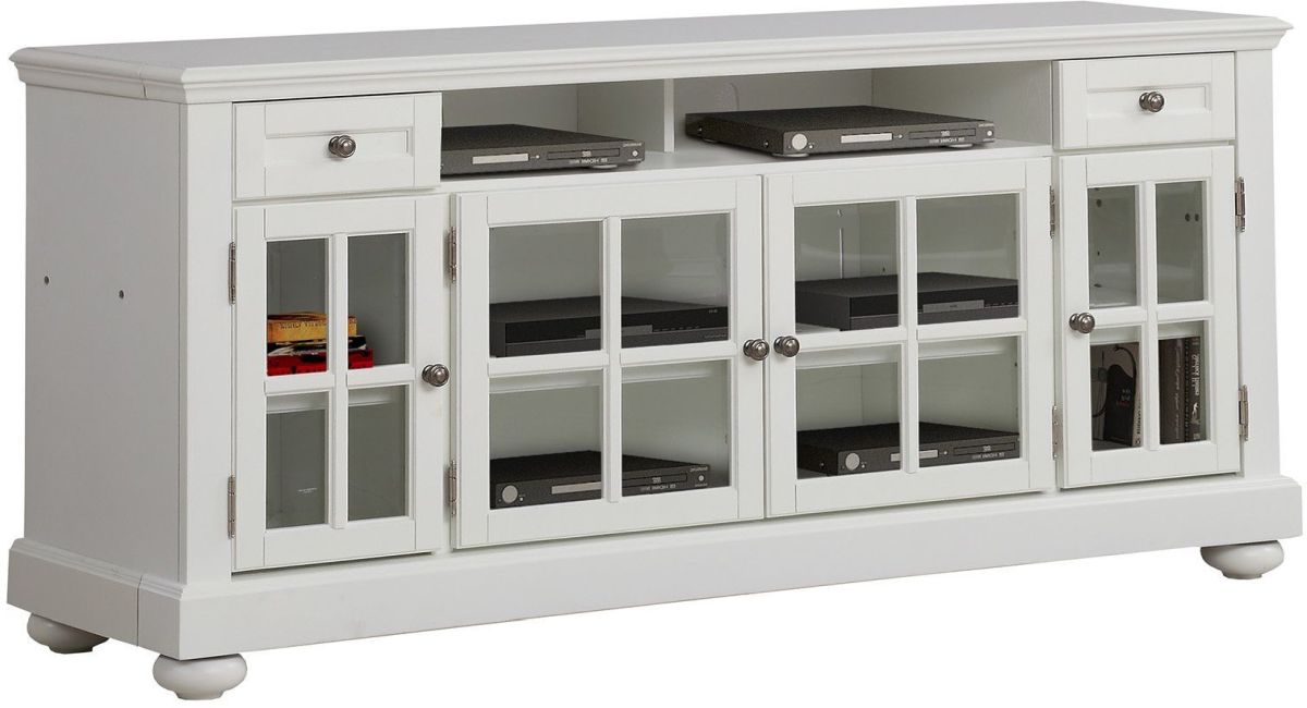 Display your television and media components in fashionable style with this 76-inch TV Console from the Cape Cod collection. Crafted in a fresh Vintage White finish, its easy going character is sure to enhance the look of any room. Glass doors, generous storage, display shelves and a multi-step finish.Read More